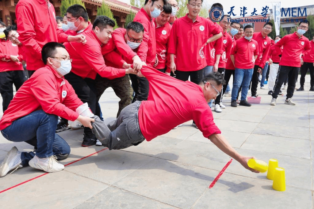 同学们抵达拓展基地后统一着装,热情的红色训练服配上天津大学和MEM项目LOGO,让大家充满了活力与激情。为了让大家更好地体会到拓展培训的目的,同学们随机分成了八个组队,拓展老师开始了第一个项目“团建破冰”,在拓展老师的指导下,各个团队分别商议着本队的队旗、队名、队歌、以及口号,虽然很多同学是初次相识,但大家已经没有了任何隔阂,热烈的讨论和认真的策划声充满了整个会场。“群龙取水”让初时的各位同学在合作过程中体会团队的合力和感受自我超越的可能性,激发每一位同学的潜能,让每一位同学融入其中,体会团队中来自伙伴的支持,培养团队协作精神。